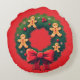 Cute, fun festive holiday pillow with colorful gingerbread house, designed with candy canes and Christmas trees on a red background. The backside has a Christmas wreath with gingerbread men and a big red bow. Great for decorating your home or gift to friends and family with a personalized seasonal message.