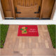Prettige feestdagen Vakantie deurmat getoond met een rode achtergrond met een schattige peperkoek man. Pas deze mat aan of koop zoals hij is.
