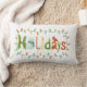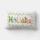 Delight friends and family with this un pillow for the holiday season. Decorate your couch or favorite chair with this festive colorful design of the word "Holidays" out of holly, snowman, candy cane, candle, pine branches, scarf surrounded by christmas lights.