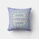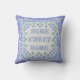 Een zeer vierkant Sierkussen of kussen, met 'Home, Sweet Home' in letters en een grenspatroon van Blauwe Periwinkle en Groene foliage op een Faux Linen-achtergrond. Als onderdeel van het collectie 'Periwinkle Patch' in Posh en Painterly, kan dit patroon gemakkelijk worden aangepast om het even welke Square Pillow of Cushion te passen.