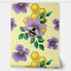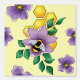 Een schattig bijtje in een lavendelkleurige bloem met een honingraat en lichtgele achtergrond.