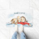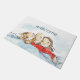 Deze deurmat heeft een afbeelding van een schattige pup en zijn ouders, een kaal man en een brunette vrouw. U kunt de tekst aanpassen.