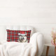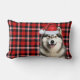 Schaduwen van rood, wit en zwart in een vakantieplaid met een feestelijke Alaskan Malamute uitgedost in een kerstmuts voor het seizoen, is een zekere winnaar voor het vakantiehuisdecor van de huisdierenliefhebber.