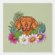 Destei's originele cartoon-illustratie van een schattige Hongaars Vizsla-hondenkop close-up omringd door kleurrijke zomerse wilde bloemen. Er is een blush roze bloem, een paarse bloem, een donkerroze bloem en een witte madeliefje samen met wat groene bladeren en takken. De achtergrondkleur is groen, maar het kan ook in een andere kleur worden veranderd, als zo gewenst.
