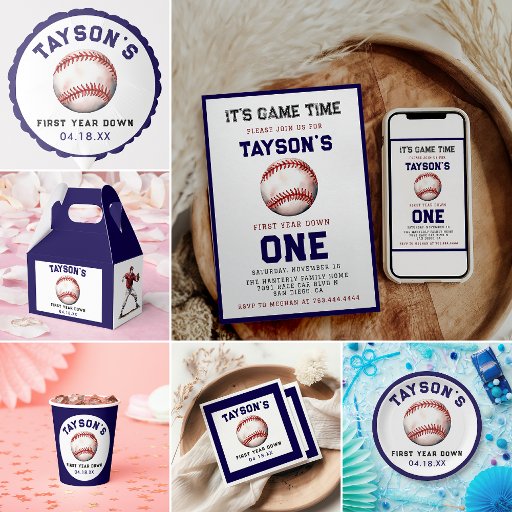 Vier het rookie-seizoen van je kleine slugger met deze Baseball "First Year Down" 1e verjaardag uitnodiging! Met klassieke honkbalgraphics en speelse tekst is deze uitnodiging perfect voor de grote dag van je baby. Personaliseer je met je feestgegevens en maak je klaar om een home run te maken met familie en vrienden!