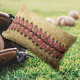 Een macrofoto van een oud gebruikt honkbal van de Scuffed met rode stikken. Ideaal geschenk voor honkbalfreak of sportfanaticus. Foto van Travis L. Lagasse of Flowstone Graphics.