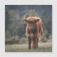 Highland koe kalf herfstgras veldfoto. Prachtig jong kalf van hoogland Schotse runderen op een herfst grasveld met gedempte kleuren. Mooie donkerharige oranje vacht contrasterend met lichtgeel groen gras en bomen in bokeh op achtergrond.