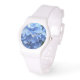 De hydrangea is een glorieuze, bloeiende struik. De bloemen kunnen roze, paars, blauw, crème en, afhankelijk van de bodem, magische combinaties van deze kleuren zijn. In sommige brandkranen zal de pH van de grond de kleur bepalen. Blauw vereist zure grond met een pH van ongeveer 5,0 tot 5,5. Roze of paars vereist een alkalische grond met een pH van 6,5 tot 7,0. Neutrale grond zal over het algemeen resulteren in roomkleurige bladen, maar u kunt ook krijgen wat sommigen "blurple" (blauw en paars) noemen. Net als clusters van kleine vlinders verzamelen de kleine bloemetjes zich in verbluffende bollen. De hydrangea staat voor genade, vriendschap, laffe schoonheid en het behoud van liefde die eeuwig duurt. Dit laatste gevoel is waarschijnlijk waarom witte hydrangea's zo populair zijn voor bridale bouquets. Het wit van dit prachtige, sportieve horloge lijst prachtig de leugenachtigheid van het blauwe hydrangea fotografisch afbeelding.