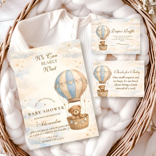 Soft, sweet, and timeless, this teddy bear baby shower design features a charming storybook bear holding a delicate balloon beneath a scalloped heirloom frame. The warm neutral palette of cream, soft blue, and gentle beige creates a cozy nursery-inspired aesthetic that feels both classic and elevated. Subtle gingham details and tiny star accents add a touch of vintage charm without overwhelming the layout. Perfect for a baby boy shower or a neutral celebration with a traditional, heartfelt feel.