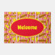 Kleurrijke welkomstmat bedrukt met hotdogs en mosterdflessen op rode en witte strepen. Perfect voor eetgelegenheden, entrees van restaurants of hotdogkarren voor festivals