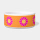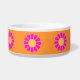Hot-roze schuim op een heldere oranje achtergrond rond deze dierenkom die gepersonaliseerd is met de naam van je hond of kat. De levendige vrolijke kleuren voegen een pop van kleur aan suppertime toe. Herinnert zich aan een roovy china patroon uit de jaren '60 of '70 voor je huisdier. Retro stijl. Daisy zal er van houden!