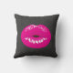 Kussen met een illustratie met hete roze lippen. Vet en levendig afbeelding. Op een zwarte gespikkelde achtergrond.