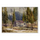 Waterverf schilderij van een hotel met drie verdiepingen en buitengebouwen omringd door roodhout en andere bomen in Calaveras County, Californië.