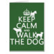 Dit is het klassieke poster uit de oorlog "Kalm houden en doorgaan", geherformuleerd als "Kalm houden en de hond uitlopen". Er zijn silhouetten van honden die op en rond de woorden staan en zitten. Het ontwerp maakt grote cadeaus of giften voor hondeneigenaars/liefhebbers, of als dank voor kennels/vets/reddingcentra en hondenwandelaars.