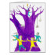 Mensen dansen rond paarse bomen. Een man die een licht op de boom houdt, terwijl een kat op een boomtak tikt.