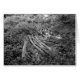 Een kaart met een zwart-wit foto van een omgehakte boom die in stapels in het onderhout is gerangschikt.