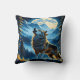 Een majestueuze wolf huilt bij een stralende volle maan boven met sneeuw bedekte bergen, omringd door torenhoge groenblijvende tinten, die de essentie van een serene nachtelijke wildernis vastleggen.