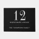 Elegante gepersonaliseerde zwarte en witte deurmat met uw huisnummer, adres en achternaam in chic lettertype. Ontworpen door Thisisnotme©