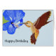 Deze bewerkbare groetings kaart shows een tekening van een mooie Hummingbird die uit een blauwe Hibiscus bloem komt, op een platte blauwe achtergrond. De tekst binnen kan voor u worden uitgegeven om uw eigen bericht te typen. Perfect voor verjaardagen, dank u, sorry en vele andere gelegenheden.