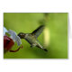 Deze Anna's Hummingbird heeft deze zomer veel tijd doorgebracht om mijn achtertuin te bedienen, en de nectar in mijn voer en mijn rozen te bemonsteren. Het genoot vooral van het zoemen binnen en uit mijn fotowaaier, en gespecialiseerd in het zijn uit nadruk! Het geduld heeft echter zijn vruchten afgeworpen, en hier is het, gepoetst tegen een wazige lichtgroene achtergrond en drink van mijn heldere leesfeeder met zijn witte plastic bloesems. Hij heeft het grootste deel van zijn gezicht in de feeder, en lijkt naar ons te piepen uit zijn kleine donkere oog, met zijn witte wenkbrauw in het donkerbruin-rode masker van zijn hoofd en keel. De donkere vleugels, enigszins wazig, zijn recht van achteren, lijken op één vleugel, en zijn kleine, grijsgroene lichaam heeft een donkerdere groene rug en vlekken neongroen langs de zijkanten. Zijn kleine voeten zijn onder hem gekruld, alsof hij klaar is om te krullen. Ga, kleine jongen. Foto copyright Gail Storrs, 2014.
