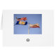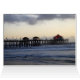 Zware surf pelt aan de kust in Huntington Beach. Binnen is de kaart een uitzicht van de pier. Op de achterkant staan de vlaggen van de VS, Californië en Huntington Beach die in de wind slaan. U kunt uw eigen tekst aan alle vier kanten van de kaart toevoegen.