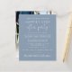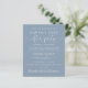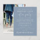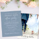 Betaalbaar stoffig blauw bewaar de datumaankondiging voor een receptie of feest om uw ontsnapping of privébruiloft te vieren. De voorkant beschikt over "Save the Date For Our Happily Ever After Party" in een mix van eenvoudige witte typografie en een elegant wit script met swashes, uw aangepaste trouwaankondiging, feest of receptie bewaar de datumdetails en uw namen in een handtekening-achtig script. Op de achterkant vind je je favoriete trouwfoto, voornamen en bruiloft- en ontvangstdata.