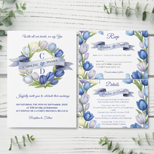 Elegant Watercolor Tulip Wreath Wedding Blue IvoryOntworpen door Sonia Chivarar