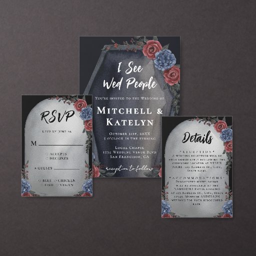 Bring the supernatural to your wedding night with this frightful " I See Wed People" backdrop. With it's monochrome color scheme, headstone and moody floral arrangements, it's the perfect decor to prepare for a haunted Halloween wedding extravaganza. Perfect for couples who plan to tie the knot in the spooky season or for anyone who loves a gothic twist.