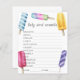 Waterverf Popsicle thema baby shower. Antwoorden: HUNKEREN, HUILEN, FOPSPEEN, FLES, NACHTLAMPJE, SLAAPZAKJE, KINDERWAGEN, RUGGENGRAAT, BOERDERIJ, KINDERSTOEL, LUIERZAK, ZWENDEL