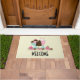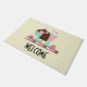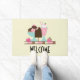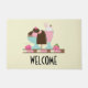 Een welkome deurmat met een zoet ijs thema. Geïllustreerd met een chocoladeijsbar, 3-schepjes sundae met een kers op de top en een aardbeienvlotter met slagroom. Kleine aardbeien en kersen. Bleke gele achtergrond. Verfrissende, warme zomerse traktaties.