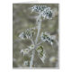 Blauwe en groene gedroogde bloemkoppen en zaadpeul, alle bedekt met ijzige piek en vorst