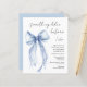 Elegante budget bruidsdoucheuitnodiging met een delicate waterverf van een blauwe coquette boog en "iets blauw voordat ik doe" in een chique script. Dit budget halfglanspapier is vergelijkbaar in gewicht met fotopapier. Een dikkere 5x7 traditionele kaart voorraad versie is ook beschikbaar (bericht ons voor de link).