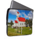 Traditionele IJslandse kerk met een rood dak en omringd door gras, enkele bomen en een paar kruisen.