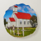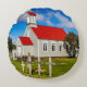 Traditionele IJslandse kerk met een rood dak en omringd door gras, enkele bomen en een paar kruisen.