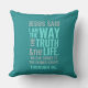 Sierkussennen met het bijbelse vers van John 14:6 Jezus vertelde hem: "Ik ben de weg, de waarheid en het leven. Niemand kan naar de Vader komen, behalve door mij." De verzen zijn in blauwe pastelkleuren en in gemengde kalligrafie en minimalistische typografie. Dit trendy, moderne geloof ontwerp is het perfecte geschenk en mode statement. #Christelijk #religie #scriptie #geloof #bible #jesus