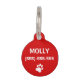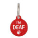 Witte en rode tag voor dove huisdieren met een witte pootafdruk silhouet. Aan de ene kant staat: "Ik ben doof" en aan de andere kant zijn er aanpasbare tekstvelden voor de naam van het huisdier en voor een telefoonnummer.