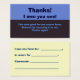 "Bedankt! Ik ben je er een schuldig!" Dit is wat er op de kaart staat, samen met "Deze kaart is goed voor één tegenprestatie. Verlossen door het terug te geven aan mij. Bedankt weer!" Op de achterkant kunt u meer specifieke informatie over de gunst schrijven. Je weet hoe dit gaat; iemand doet je een groot plezier en je zegt: "Bedankt, die ben ik je schuldig", maar... ze geloven het niet ECHT. Met deze kaart kun je show dat je echt oprecht waardeert wat ze voor je hebben gedaan, en aantonen dat je ECHT van plan bent om hen te helpen wanneer ze het nodig hebben. Natuurlijk is dat gedeelte op de achterkant waar 'Opmerkingen' staat een goede plek om te schrijven in wat je NIET voor hen zult doen haha...zoals het schilderen van hun huis, of het buigen van de waarheid om ze uit een strakke plek te krijgen; je grenzen zijn aan jou. Dit is "soort van" alleen maar voor de lol, maar nogmaals, zoals ik zei: soms wil je dat mensen de impact van je diepe dankbaarheid voelen. Dit zal het luchthartig doen zonder jullie ongemakkelijk te maken.