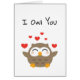 Een kleine leuke en gelukkige illustratie met warm rood hart dat rondvliegt. Een grappige vogel in lichtbruine kleuren met felgele poten. Deze uil brengt geluk en liefde, en houdt ervan je op te vrolijken of beste wensen te sturen naar iemand die je leuk vindt. U kunt de achtergrond ook aanpassen voor uw behoeften.