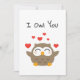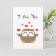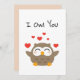 Een kleine leuke en gelukkige illustratie met warm rood hart dat rondvliegt. Een grappige vogel in lichtbruine kleuren met felgele poten. Deze uil brengt geluk en liefde, en houdt ervan je op te vrolijken of beste wensen te sturen naar iemand die je leuk vindt. U kunt de achtergrond ook aanpassen voor uw behoeften.