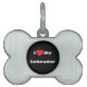 Huisdieridentificatietag in de vorm van een bot met zwarte achtergrondkleur en witte letterkleur bedrukt met aanpasbare sjabloontekst I ♥️ love My Labrador op petten, shirts en huisdierproducten door TheFabricSeal print on demand winkel op Zazzle.com #ZazzleMade https://www.zazzle.com/store/thefabricseal