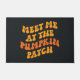 Dit ontwerp is voorzien van de uitdrukking "Meet Me at the Pumpkin Patch" weergegeven in een vet, retro-geïnspireerd lettertype met een speelse, golvende uitstraling. De tekst is gerangschikt in een gespreide, diagonale lay-out, waardoor het ontwerp een dynamisch en levendig gevoel krijgt. Het kleurenschema omvat warme herfsttinten, waarbij de bovenste woorden in een goudgeel overgaan naar een rijk sinaasappel naar de onderkant, waardoor een gradiënt-effect ontstaat dat het feestelijke thema van de herfst verbetert.