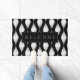 Ikat textielpatroon aangepaste welkom deur mat. Voeg je eigen bericht, familienaam, monogram, achternaam of grappige quote toe. Luxe cadeau idee voor nieuw huis / housewarming of verloving / huwelijksfeest. Zwart-wit of aangepaste kleur achtergrond. Stijlvolle moderne typografie met golvende lijndruk. deurmat teken sjabloon. Creëer uw eigen entreemat / tapijt voor voordeur / entree of hal / locatie. woondecoratie / decoratie voor uw huis. Voeg uw eigen monogram letter initialen of achternaam. Mooi mode ontwerp voor een moderne woning.