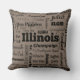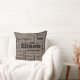 Een charmerende kussen met de staatsnaam Illinois en enkele van zijn steden en steden in zwarte tekst van verschillende lettertypen en grootten op een taupe achtergrond. De rug is stevig zwart met het woord "Illinois" in wit. Draai gewoon de kussen om de blik van je kamer snel te veranderen.