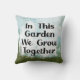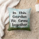 Een prachtig typografisch stuk met tuinthema met de woorden "In deze tuin groeien we samen". Het is groen en blauw met zwarte tekst en een wit accent onder het citaat.