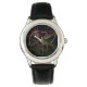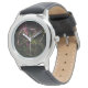 Een zwart horlogegezicht met een paddenstoel of UFO-vormig ontwerp.