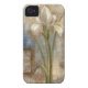 © Silvia Vassileva / Wilde Apple. Het afbeelding show een witte iris, en een decoratieve vierkant tegel aan de zijkant. De tegel aan de linkerkant heeft een bruine rand.
