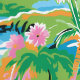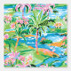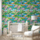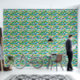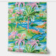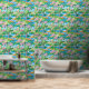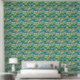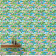 Een naadloos patroon met groene en roze palmbomen op kleine eilandjes in de oceaan, weergegeven in een waterverf stijl. Het ontwerp legt de serene en tropische essentie van het eilandleven vast met levendige kleuren en vloeiende, artistieke penseelstreken. En blauwe mariene planten. Het ontwerp vangt een grillige en levendige onderwaterscène met speelse dolfijnen en kleurrijke waterflora.