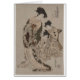 Deze Japanse kleurenafdrukken werden in de 18e eeuw gemaakt door Isoda Koryusai (1764 - 1788). De naam in het Japans is: "Hinagata Wakana no Hatsu Moyo". Hier zien we een Japanse dame en haar twee aanwezigen, allemaal gekleed in prachtig ontworpen lange stromende kimonos met bloem-design. De dame draagt ook een soort jas of sjaal die een vis in een stroomopwaarts of in een waterval laat zwemmen. De Japanse kunstenaar gebruikte meestal lichtkleuren in deze gedrukte tekst: beige, bruine, witte en zwarte. Zoals gebruikelijk in Japan ondertekende Isoda Koryusai zijn naam in Kanji karakters en Hiragana (Japans schrijven).