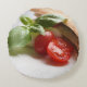 Gooi een kussen met gezond Italiaans voedsel, bestaande uit een panini-sandwich en een tomaat, groene basilicumbladeren en mozzarella-kaas op een witte achtergrond.