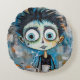 Een grillig karakter met oversized ogen en stekelig haar wordt afgebeeld met een verblufte uitdrukking zittend aan een tafel met een stomende kop en een eigenzinnige broodrooster. Achter het personage, de achtergrond is levendig, gevuld met verschillende schetsen en krabbels die een speelse, chaotische sfeer aan de scène geven.